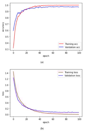 (a) Training/validation accuracy and (b) loss trend with each epoch.