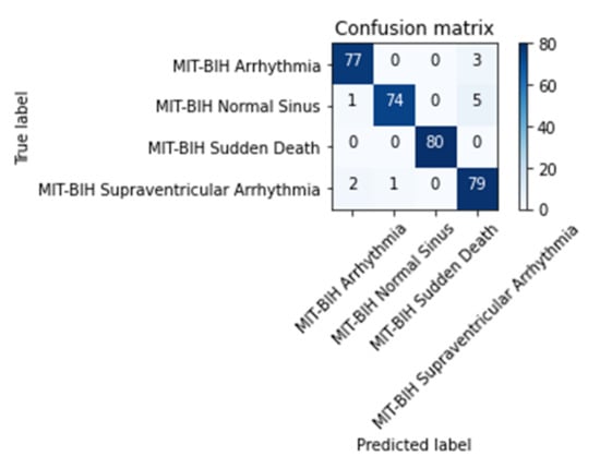 According to Figure 10, 80 images of each class were tested for classification and prediction. For ECG ‘arrhythmia’ class, 77 images were classified or predicted correctly, however, three images were misclassified to the ‘supraventricular arrhythmia’ class. In ECG ‘normal sinus’ prediction, 74 images were classified in a proper class; however, there was one image predicted as ‘arrhythmia’ and five images were predicted as ECG ‘supraventricular arrhythmia’ class. An outperformed result compared to others was achieved in ECG ‘sudden death’ class with 100% correct classification result. In the last class, i.e., ECG ‘supraventricular arrhythmia’, 79 images were predicted correctly and two images were misclassified to ECG ‘arrhythmia’ and one image predicted as ECG ‘normal sinus’ class.