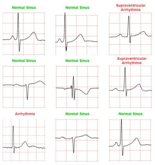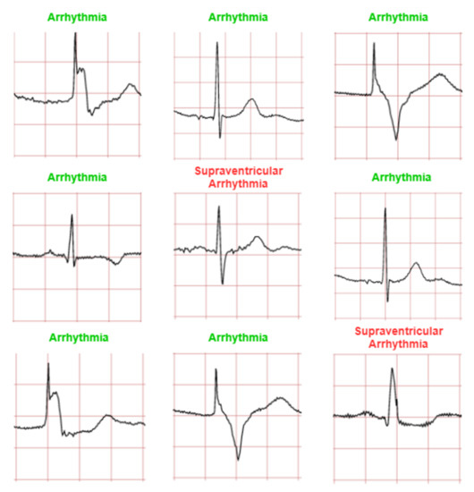Prediction for ‘arrhythmia’ ECG waveforms. (Note: red and green title indicated incorrect and correct prediction, respectively).