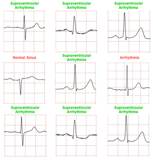 Prediction for ‘supraventricular arrhythmia’ ECG waveforms. (Note: red and green title indicated incorrect and correct prediction, respectively).