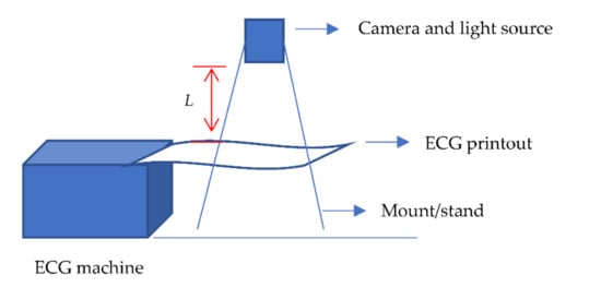 Illustration of possible hardware setup for investigating standard image capture with predetermined L distance from the ECG printout to the camera.