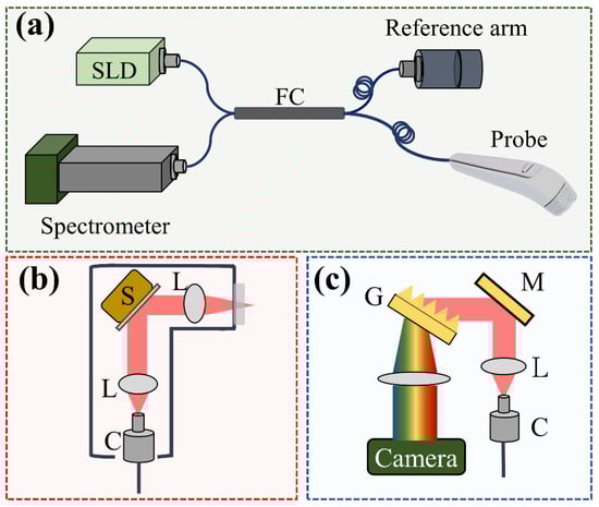 (a) Schematic diagram of the SD-OCT system for skin scanning, (b) design of the handheld probe with a MEMs scanner, and (c) optical setup of the spectrometer. S: MEMs-based scanner, L: lens, C: collimator, G: transmission grating, M: mirror.