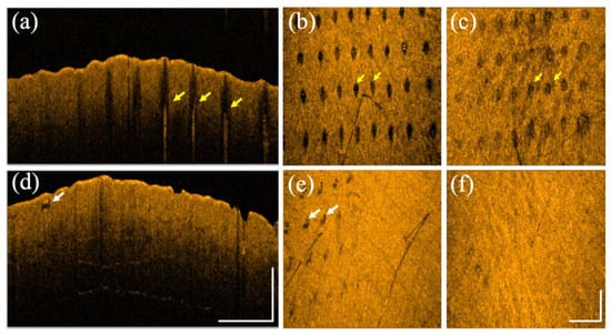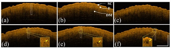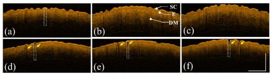(a–c) 2D OCT images of healthy forearm skin of a 30-year-old female obtained before laser exposure. (d–f) OCT images corresponding to (a–c) after exposure to the fractional CO2 laser with energies of 10, 20, and 30 mJ/microbeam, respectively. The yellow arrows indicate the induced photodamage, and the scale bar represents 1 mm in length. SC: stratum corneum, E: epidermis, and DM: dermis.