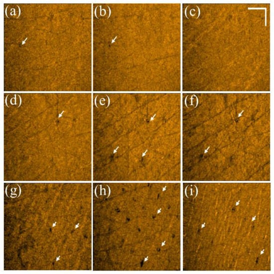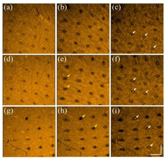 The same experimental procedures were repeated using a picosecond Nd:YAG laser to create LIOBs. The forearm skin of a 26-year-old female volunteer was exposed to a picosecond laser with exposure energies of 1.3, 1.9, and 2.5 mJ/microbeam. Figure 4a–c show the 2D OCT results of the forearm skin obtained before laser exposure and Figure 4d–f represent the 2D OCT images obtained after laser exposure with the abovementioned energies, respectively. The stratum corneum, epidermis, and dermis layers can be identified from the OCT results. The regions indicated by the yellow squares in Figure 4d–f show the induced LIOBs, and magnified images are shown at the lower corners in Figure 4d–f. Here, the yellow arrows indicate that the dark holes (vacuoles) are the induced LIOBs, which can be identified from the OCT results, showing that no backscattered intensity can be detected from the inner vacuoles. Additionally, it can be noted that the size of the vacuoles increased with the exposure energy. In addition to investigating the photodamage using 2D OCT images, the corresponding en face images are shown in Figure 5. Figure 5a–c show the en face images at depths of 300, 330, and 360 μm after exposure to 1.3 mJ/microbeam, and the white arrows indicate the induced vacuoles at different depths. Similarly, the en face results for exposure energy of 1.9 mJ/microbeam are shown in Figure 5d–f corresponding to the depths of 430, 460, and 490 μm, respectively. Figure 5g–i show the en face images at the depths of 150, 180, and 210 μm with an exposure energy of 2.5 mJ/microbeam. Note that the diameters of the vacuoles can be estimated from the OCT results.