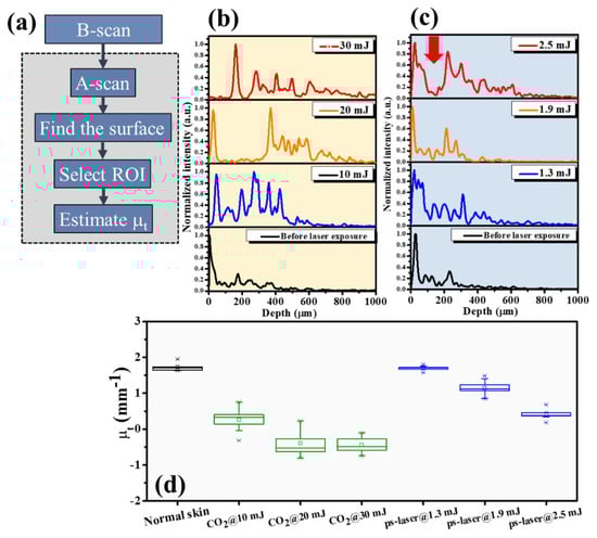 Thus, an image processing algorithm was developed to evaluate the attenuation coefficients of normal and laser-treated skin, whose flowchart is shown in Figure 6a. First, the skin surface was detected, and the attenuation coefficient of a selected depth range was estimated using Equation (5). Figure 6b shows the average A-scan profiles at four regions indicated by the white squares in Figure 2, corresponding to the intact skin structure before CO2 laser exposure and the exposed skin at 10, 20, and 30 mJ, respectively. Here, five adjacent A-scans were used to estimate the average A-scan profile. Figure 6b shows that the backscattered intensity varied with the photon energy. The surface peak disappeared after 30 mJ laser exposure due to tissue vaporization induced by the high exposure energy. Figure 6c plots the averaged A-scan profiles of skin locations indicated by the white rectangular squares in Figure 4. Figure 6c was obtained before exposure to the fractional picosecond laser and after laser exposure with 1.3, 1.9, and 2.5 mJ/microbeam. In contrast, no significant change in the backscattered intensity was observed when lower exposure energy was applied. However, higher exposure energy such as 2.5 mJ/microbeam caused a larger cavitation bubble, resulting in a significant change in the backscattered intensity, as indicated by the red arrow. Then, to compare the differences in the attenuation coefficients of normal skin, MAZ, and LIOB, eleven normal skin regions, eleven MAZs for each exposure energy level (10, 20, and 30, mJ/microbeams), and eleven LIOB locations for each energy level (1.3, 1.9, and 2.5 mJ/microbeam) were included for estimation of the attenuation coefficients. Figure 6d plots the results of the estimated attenuation coefficients. For normal skin, the average attenuation coefficient was 1.73 mm−1. The averaged attenuation coefficient decreased to −0.48 mm−1 after laser exposure at 30 mJ/microbeam. The negative attenuation coefficient for fractional CO2 laser exposure was due to the stronger backscattered stripes induced by the photon energy, as shown in Figure 2. Regarding the results for the fractional picosecond laser with an exposure energy of 1.3 mJ/microbeam, no significant change was observed in comparison to the estimated effects of normal skin without laser exposure. Still, the attenuation coefficients decreased with the exposure energy of the picosecond laser. The results indicate that the photodamage induced by the fractional CO2 and picosecond lasers can be identified from the estimated effects of the attenuation coefficient. Moreover, the photodamage along with the depth can be differentiated by the attenuation coefficient.
