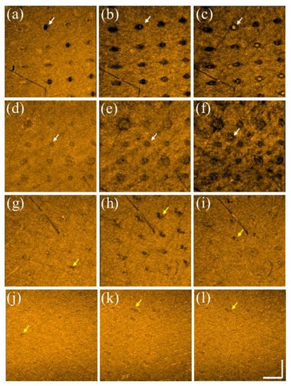 In addition to studying the photodamage induced by the two lasers, tissue recovery was investigated. Here, the same experimental procedures, including applying the fractional CO2 and picosecond lasers, were conducted on the volunteers’ skin. Figure 7a–c show the en face images obtained at depths of 200, 400, and 600 μm beneath the skin surface after fractional CO2 laser exposure with an energy of 30 mJ/microbeam. The results show that the tissue at the shallow depth was vaporized, causing hole structures. Instead, stronger backscattered spots in the center of the MAZs can be identified resulting from the damaged tissue accumulated at deeper depths. The white arrows indicate the induced MAZs at different depths. Moreover, the damaged area increased with the depth, as shown in Figure 7a–c. Subsequently, Figure 7d–f represent the corresponding en face images obtained at the same depths on Day 7. It was difficult to scan the same regions exactly on Days 1 and 7 for comparison, but the close areas were chosen for OCT scanning. After seven days, the wounds could still be identified, but the recovered progress could also be determined from the OCT results. Additionally, Figure 7g–i show the en face results of the picosecond laser exposure with an energy of 2.5 mJ/microbeam on Day 1, and Figure 7j–l represent the results obtained on Day 3. Compared with the fractional CO2 laser results, the intra-dermal cavities induced by the picosecond laser, as indicated by the yellow arrows present almost at the focusing depth, and the extra damage to the surrounding tissue along with the depth and transverse directions can be significantly reduced. After three days, significant tissue recovery could be identified, and only slight scars, indicated by the yellow arrows, could be found at the focusing depth.