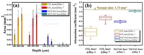 Moreover, the damaged areas at various depths induced by both lasers can be estimated from the OCT images, and the attenuation coefficients can be compared during tissue recovery. The estimated damaged areas and the results of the attenuation coefficient are plotted in Figure 9a,b, respectively. The estimated effects of the fractional CO2 laser show that no significant improvement in the damaged areas at the three considered depths could be observed. In contrast, the damaged regions decreased rapidly on Day 3 for the fractional picosecond laser. Figure 9b shows that the estimated attenuation coefficient of the fractional CO2 laser treatment slightly decreased from Day 1 to Day 7 after treatment. In contrast to the fractional CO2 laser treatment results, the attenuation coefficient of the fractional Nd:YAG laser is close to that of the normal skin without laser treatment, which means that the tissue recovered in three days after exposure to the fractional picosecond Nd:YAG laser.
