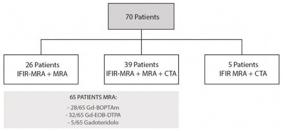 All patients underwent IFIR-MRA (n = 70). In most cases (n = 65) paramagnetic contrast medium was injected (n = 28 Gd-BOPTA, n = 32 Gd-EOB-DTPA, n = 5 Gadoteridol). A total of 44 patients also underwent a CTA with a median time interval between examinations of 8 months (IQR 2–12), either before or after MRI (Figure 1).