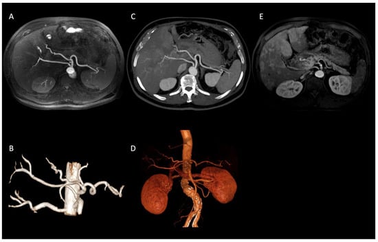 Axial IFIR-MRA (A) and CTA (B) MIP reconstructions properly showing the direct origin of the right hepatic artery from the aorta (Type XI according to Michels’ classification system) and the remaining main celiac trunk branches up to the proximal bifurcations (spleen and hepatic hilum). On MRA (C) MIP reconstruction image quality and resolution are lower, not allowing the proper assessment of proximal bifurcations. IFIR-MRA (D) and CTA (E) 3D reconstructions, showing a comparable diagnostic performance.