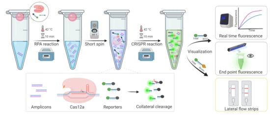- Wang, B.; Wang, R.; Wang, D.Q.; Wu, J.; Li, J.X.; Wang, J.; Liu, H.H.; Wang, Y.M. Cas12aVDet: A CRISPR/Cas12a-Based Platform for Rapid and Visual Nucleic Acid Detection. Anal. Chem. 2019, 91, 12156–12161. [Google Scholar] [CrossRef]