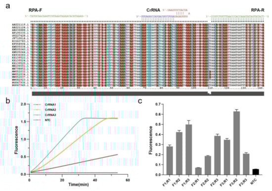 Establishment of RPA-CRISPR/Cas12a system. (a) Relatively conserved sequence of mecA gene of MRSA shows target and crRNA sequences on the polymerase coding region. (b) Screening for CrRNAs. Real-time fluorescence curves based on PCR-CRISPR/Cas12a on different 3 CrRNAs to detect efficiency. NTC: no template control. (c) Screening of RPA primers. Fluorescence values based on RPA-CRISPR detection at different RPA primers. Gray: Postive; Black: Negative.