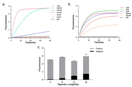 The CRISPR system consists of three essential components: Cas12a enzyme, CrRNA, and reporter, and we optimized each element to enhance detection efficiency. Firstly, we tested the effect of different Cas12a enzyme concentrations on the experiments by real-time fluorescence. The result showed that fluorescence reached a plateau more quickly as the enzyme concentration increased, allowing the detection to be more effective. Hence, we applied 1 M as Cas12a concentration (Figure 3a). Then, we explored the optimal CrRNA concentration. The result illustrated that a higher concentration of CrRNA was used, a shorter time was taken to reach saturated fluorescence intensity and higher fluorescence intensity. The detection efficiency was better when the CrRNA concentration reached 2 M. Therefore, we chose a CrRNA concentration of 2 M for the subsequent assay (Figure 3b). We further optimized the length of FQ reporters since the reporter is crucial in fluorescence analysis. As illustrated in Figure 3c, the fluorescence intensity increased with extending the length of the FQ reporter, but background fluorescence also increased; fluorescence intensity decreased as reporter length increased beyond 8 bp, but background fluorescence still rose. In our subsequent experiments, we employed the 5 bp FQ reporter to avoid the impact of background fluorescence causing false positives.