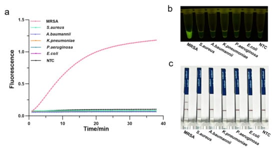 Determination of the specificity of one-tube RPA-CRISPR/Cas12a detection of MRSA using 5 common pathogenic bacteria. (a) Real-time fluorescence intensity curves of the RPA-CRISPR/Cas12a assays for MRSA and different bacteria strains. NTC: no template control. (b) Endpoint visualization fluorescence-based one-tube RPA-CRISPR/Cas12a detection of MRSA and 5 different bacteria strains. A strong fluorescent signal was observed with the naked eye only when MRSA sample were added. (c) Specificity test of the RPA-CRISPR/Cas12a LFS detection assay. Only the MRSA sample showed a clear test line.
