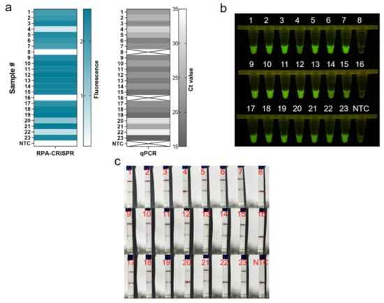 Evaluation of RPA-CRISPR/Cas12a assay for MRSA with 23 clinical isolates. (a) Real-time fluorescence-based one-tube RPA-CRISPR/Cas12a detection of MRSA and selection of fluorescence of CRISPR reactions for 10 min for heat map, validated by qPCR in parallel. Samples 8 and 16 are negative, the rest are positive. ×: indicates a negative sample. NTC: no template control. (b) Endpoint visualization fluorescence-based one-tube RPA-CRISPR/Cas12a detection of MRSA. The only samples that do not show fluorescence signals are samples 8 and 16. (c) Detection of MRSA in clinical isolates with the RPA-CRISPR/Cas12a LFS assay. Test lines are visible on all samples except samples 8, 16 and 22, which do not show test lines.