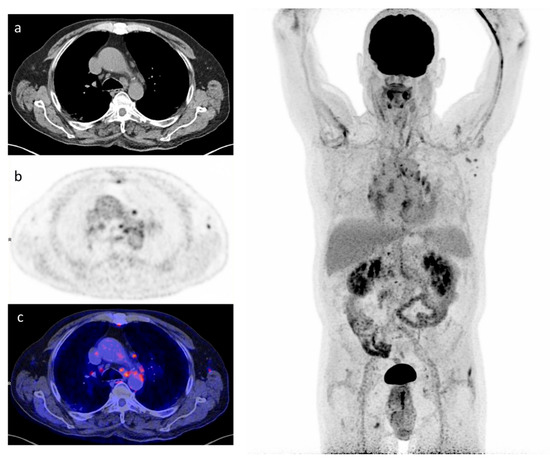 A 64-year man admitted for multilobar pneumonia caused by SARS-CoV-2. The [18F]FDG-PET/CT at 3 months after symptom onset shows increased [18F]FDG uptake in residual pulmonary lesions (TLG 124,11) and mediastinum lymph node (SUVpeak 1,73). Pulmonary function tests evidenced severe pulmonary diffusion impairment, with a diffusing capacity of the lungs for carbon monoxide 41% of the predicted value. Left: (a) CT transverse slice, (b) [18F]FDG-PET slice, and (c) fused [18F]FDG-PET and CT images. Right: whole-body, maximal intensity projection image, displaying mediastinal lymph nodes with [18F]FDG uptake.