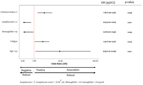 Patients with positive and negative [18F]FDG-PET/CT results significantly differed in age (59.82 ± 8.52 vs. 51.00 ± 8.09 years, respectively, p = 0.03), Charlson index score ≥1 (66.7 vs. 100%, p = 0.038), presence of fatigue (90.9 vs. 44.4%, p = 0.024) and respiratory distress (90.9 vs. 44.4%, p = 0.024), hemoglobin levels (13.41 ± 1.91 vs. 15.24 ± 1.58 g/dL, p = 0.041), and lymphocyte count (1.78 ± 0.53 vs. 2.47 ± 0.49 × 103/µL, p = 0.011) at 2–3 months post-discharge (Figure 2).