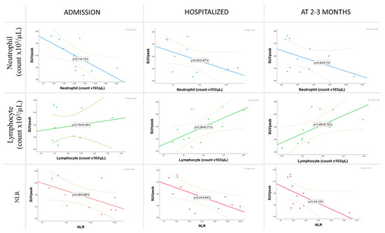At the follow-up at 2–3 months, the SUVpeak was significantly correlated with neutrophil count (rho = −0.679, p = 0.022), lymphocyte count (rho = 0.791, p = 0.004), and NLR (rho = −0.727, p = 0.011). No significant correlation was found between pulmonary TLG and any analytical parameter under study (Figure 3).