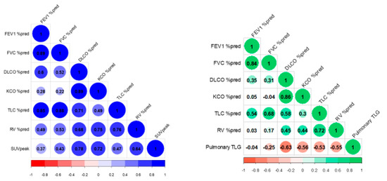 Correlogram showing the association of respiratory function test results with the SUVpeak of the target lesion and pulmonary TLG.