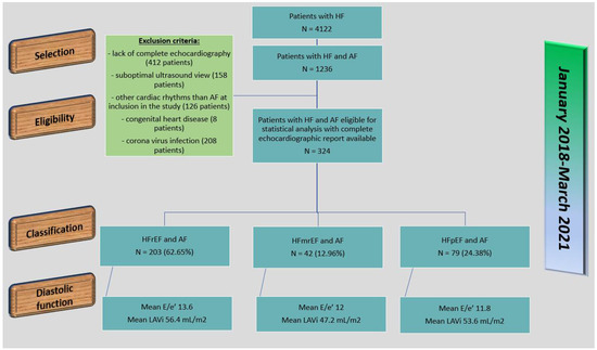 Permanent AF was the most frequent type and it was present in 61.1% of the patients (198 patients: 133 patients in subgroup 1, 20 patients in subgroup 2, 45 patients in subgroup 3). Persistent AF was present in 24.07% of the patients (78 patients: 40 in subgroup 1, 8 in subgroup 2, 30 in subgroup 3), and paroxysmal AF was present in 14.8% of the patients (48 patients: 30 in subgroup 1, 14 in subgroup 2, 4 in subgroup 3). The majority of the patients with the diagnosis of chronic HF and AF were excluded from the study mainly because of the impossibility to obtain their initial echocardiography reports or because they had a suboptimal ultrasound view; other reasons for excluding patients were the presence of other cardiac rhythms, such as atrial flutter or multifocal atrial tachycardia; the lack of signed informed consent to participate in the study; and SARS-CoV-2 infection for patients included between March 2020 and March 2021. The study protocol is shown is Figure 1.