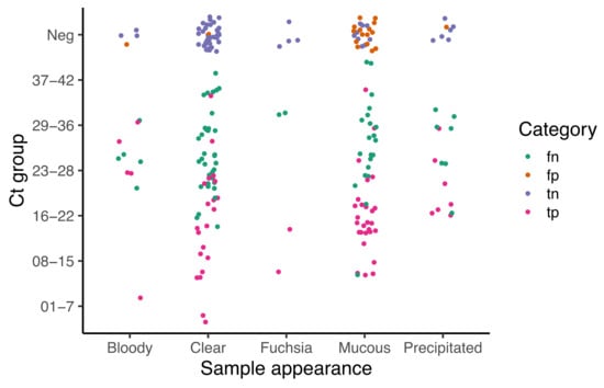 This approach gave an accuracy of 68%, with an elevated number of false negatives (summarized in Table 3). Global agreement with qRT-PCR, calculated as global kappa index, is fair (0.34), however, after analyzing data by type of sample, better agreement is observed with saliva (0.44, 0.24–0.66), followed by NPA (0.03, −0.20–0.26), and NPS (0.02, 0.16–0.20) (see Supplementary Table S1). The high number of faint results is associated with mucus in the sample and the viral load (see Figure 2). Those samples classified as mucus resulted more often in false positives than those with any other type of appearance; there are false negatives in all categories of sample quality but they concentrate in groups with Ct values above 23 (Figure 2), which again represents the characteristic sensitivity identified during optimization. Interestingly, bloody samples and those collected in transport media containing pH indicator (fuchsia), which remain reddish after boiling, did not tend to give false negatives.