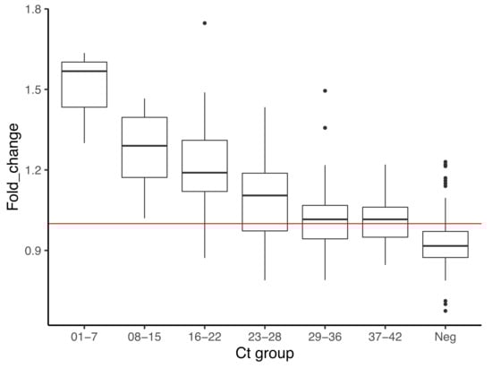 Relation between fold change and viral load. Y-axis indicates fold change values for a total of 208 samples, with the horizontal line corresponding to the threshold established. Boxes contain average and standard deviation of the fold change per Ct group, where Neg corresponds to the group with undetectable RNA of SARS-CoV-2 by qRT-PCR. The red line marks a fold change = 1.0.