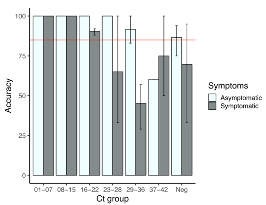 Performance of the application-mediated detection among symptomatic and asymptomatic patients. Accuracy = tp + tn/total of symptomatic or asymptomatic in each Ct group; standard deviation was established based in the calculated accuracy per type of sample in each group. The red line marks a 85% of accuracy, required in Colombia for SARS-CoV-2 diagnostic tests.