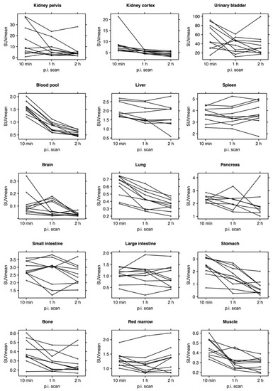 Decay-corrected SUVmean in blood and major organs is plotted individually for all patients in Figure 2. The kidneys were the primary excretion route, whereas only little excretion was observed through the hepatobiliary/gastrointestinal tract. There was a relatively high, but decreasing, activity in the blood pool. Brain, lungs, bone and muscle showed almost no activity.