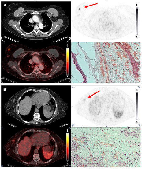 [68Ga]Ga-NODAGA-E[c(RGDyK)]2 PET imaging in breast cancer. (A) Representative transverse CT, PET (1 h p.i.) and fused PET/CT images of primary tumor lesion (red arrow) with a high uptake of [68Ga]Ga-NODAGA-E[c(RGDyK)]2 (patient 6) and immunohistochemistry staining for integrin αvβ3 in primary tumor showing intense staining. (B) CT, PET (1 h p.i.) and PET/CT of primary tumor lesion with a low uptake of tracer (patient 7) and immunohistochemistry staining confirming low intensity of integrin αvβ3 staining.