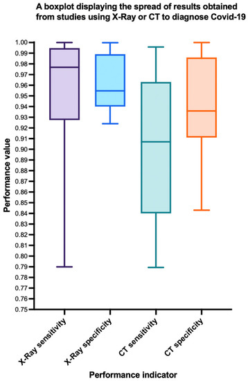When assessing model performance between the two imaging modalities, calculating the median and respective interquartile ranges, the performance of models using X-ray was more consistent (see Figure 2, a boxplot demonstrating the smaller interquartile range). This may be due to the ease of 2D image processing, and the lack of a requirement for segmentation layers in the network or slice selection. The reporting of significant differences between the performances of the model and the radiologist was only provided by [34], where there was no reported significant difference for the model used in the study.