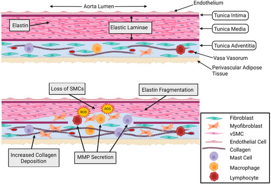 Healthy and aneurysmal aorta cross-sections. Comparison of healthy (Top) and aneurysmal (Bottom) aortic wall cross-sections. The healthy aortic wall shows an organized medial layer and no inflammatory cell infiltration. In the adventitial layer, there is minimal myofibroblast presence, low levels of inflammatory cells, and homeostatic levels of collagen. The aneurysmal aortic wall shows thinning of the medial layer, SMC loss, elastin fragmentation, inflammatory and mesenchymal cell infiltration of the medial layer, fibroblast conversion to myofibroblasts, reactive oxygen species (ROS), increased inflammatory cell presence, increased collagen deposition, and increased MMP secretion. Cell types are indicated in the figure legend. Figure created using Biorender.com accessed on 14 January 2022.