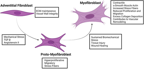 Fibroblast to myofibroblast transformation. Characteristics and inducers of transformation are indicated for adventitial fibroblasts, adventitial proto-myofibroblasts, and adventitial myofibroblasts. Figure created using Biorender.com accessed on 14 January 2022.