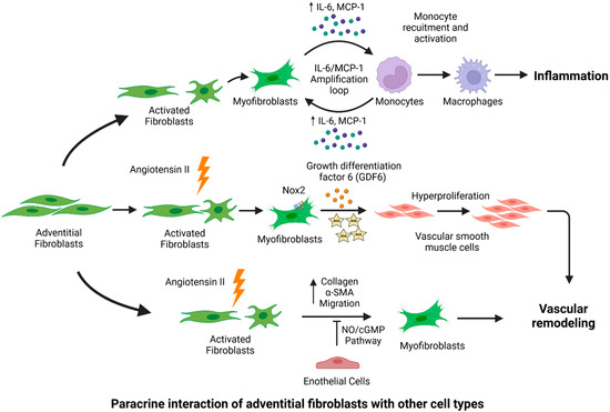 Using a mouse model with inducible fibroblast-specific deficiency of NADPH oxidase-2 (Nox2) (Fibro-Nox2KO mice), a recent study demonstrated the crucial role of fibroblast Nox2 in the development of Ang II-induced aortic vascular remodeling [118]. A fibroblast-specific deficiency of Nox2 displayed significantly attenuated vascular remodeling and hypertension in response to chronic Ang II infusion in mice. Mechanistically, the Ang II-induced vascular remodeling was attributed to the fibroblast Nox2-mediated regulation of paracrine signaling to medial SMCs via growth differentiation factor 6 (GDF6) [118]. In vitro experiments demonstrated Ang II-mediated adventitial remodeling via the phenotypic transformation of adventitial fibroblasts [119]. A co-culture of fibroblasts with ECs revealed the interaction between cell types and the inhibitory effects of ECs on the Ang II-induced phenotypic modulation of adventitial fibroblasts via the NO/cGMP signaling pathway [119].