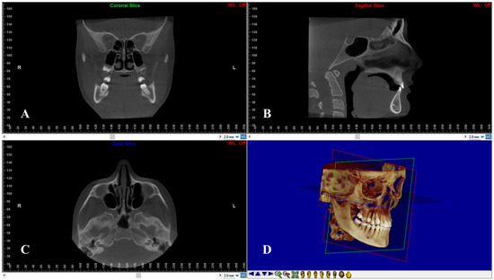 Head re-orientation on coronal (A), sagittal (B) and axial (C) planes of CBCT scans. The 3D image (D) shows the head orientation on a 3D space.