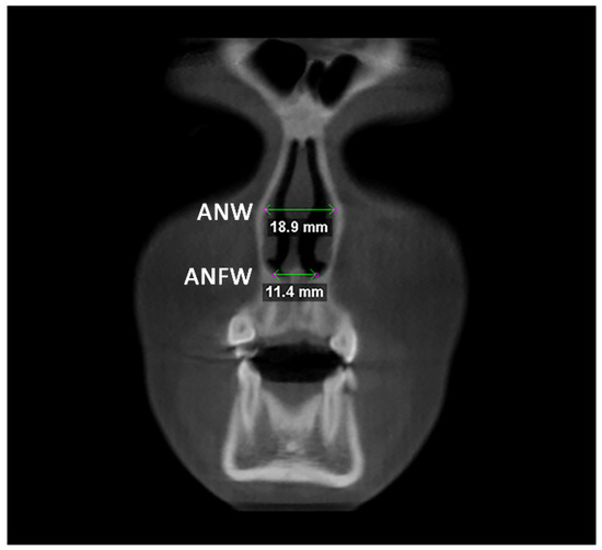 Linear measurements of anterior nasal width (ANW) and anterior nasal floor width (ANFW) in the coronal plane.