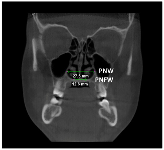 Linear measurements of the posterior nasal width (PNW) and the posterior nasal floor width (PNFW) in the coronal plane.