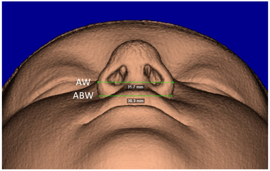 Facial soft-tissue linear measurements of the alar base width (ABW) and the alar width (AW).