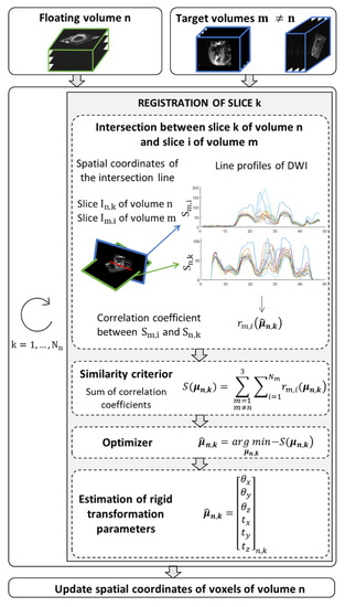 Algorithm to find the new spatial coordinates of voxels that ensure a global consistency between the floating volume n and the other two volumes (target) in the domain shared by the three orientations. The similarity criterion, S, corresponds to the summation of correlation coefficients () between diffusion weighted images extracted of the volume n and reference diffusion weighted images, . The intensity level line profiles interpolate at points that belong to the intersection of the two image planes that serve to calculate the correlation coefficients. The parameters vector of rigid transformation to apply to the slice k of volume n is estimated by minimizing the similarity criterion.