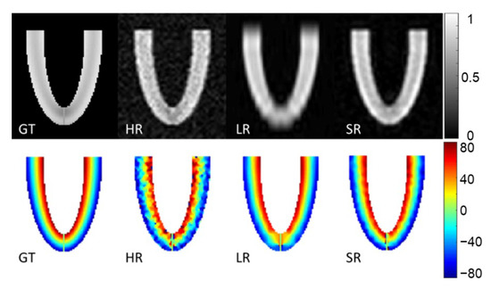 Magnitude image and helix angle (HA) reconstruction of the numerical phantom for a slice in XZ orientation. Ground truth (GT), high-resolution (HR), low-resolution (LR) and super-resolution (SR) magnitude images are in the first row (arbitrary units). The second row shows HA (degrees), ground truth (GT) and HA calculated from high-resolution (HR), low-resolution (LR) oriented in the XY plane and super-resolution (SR) datasets.