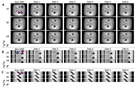Reconstructed images from the physical helical phantom shown in x-y (A); y-z (B); and x-z (C) planes (non-DWI and DWI from six diffusion directions): low-resolution (LR) and super-resolution (SR) were obtained with the same scan time (3.5 min); native high-resolution images (HR, 14 min scan time) are shown for reference. The pink and blue arrows indicate the straight and helical bundles, respectively. Blurring can be seen on LR images, especially in the x-z plane (bottom views).