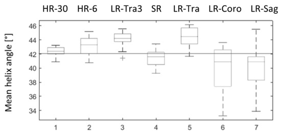 These results were confirmed with the physical helicoidal phantom. Coronal and sagittal scans showed larger errors in HA measurements than the transverse scan. Indeed, in this phantom, there was no change of the eigenvector direction in the transverse direction. Nevertheless, all LR acquisitions led to a relatively large bias in HA estimates, with an overestimation for the coronal and sagittal scans and an underestimation for the transverse scans. Several factors could explain this result, including the use of the dual gradient scheme (with only six directions, non-uniformly distributed on a sphere) which may lead to an anisotropic noise propagation [34], and imperfections/asymmetries of the gradient coil system, which both may lead to orientation-dependent measurements [35,36,37]. The bias was significantly mitigated with the SR strategy, and SR estimates were close to the HR DTI scan with 30 diffusion directions. Therefore, the combination of three scans with different orientations may reduce the dependence of the measurement on the orientation and the underlying structure.