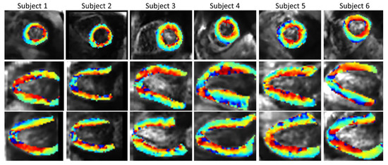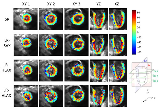 Figure 10 shows the SR HA maps obtained from all six subjects. The overall SNR gain with the SR reconstruction across the volunteers (Supplementary Materials Table S3) is 1.88 in comparison to SAX volume, 1.51 in comparison to HLAX volume and 1.89 in comparison to VLAX volume.