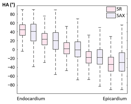 Evolution of in vivo HA measurement from endocardium to epicardium for SR and LR SAX volumes (pooled data from the whole LV and from N = 6 subjects).