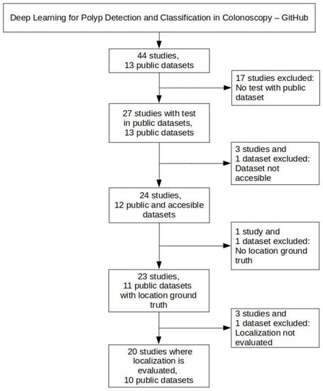 Figure 1 shows the criteria for selecting public colonoscopy image datasets and polyp localization studies. This selection started with the 44 studies and 13 public datasets collected as of February 2022 in the GitHub repository associated with our review on DL for polyp detection and classification in colonoscopy, mentioned above.