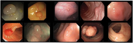 - Mesejo, P.; Pizarro, D.; Abergel, A.; Rouquette, O.; Beorchia, S.; Poincloux, L.; Bartoli, A. Computer-Aided Classification of Gastrointestinal Lesions in Regular Colonoscopy. IEEE Trans. Med Imaging 2016, 35, 2051–2063. [Google Scholar] [CrossRef] [PubMed]