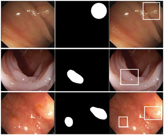 Conversion from binary mask annotations to bounding boxes. First column: original polyp images. Second column: binary mask annotations. Third column: obtained bounding box annotations over the original polyp images.
