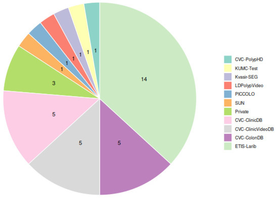 Among the public datasets, as Figure 4 shows, the ETIS-Larib dataset was the most widely used for testing the detection models (14 out of 20 studies), probably due to the fact that it was one of the test datasets for the automatic polyp detection subchallenge at MICCAI 2015 [11]. The highest F1-score in this dataset was achieved by Pacal et al., 2022 [51] (0.91). The next datasets used by the greatest number of studies (5 out of 20) were CVC-ColonDB, for which the highest F1 (0.96) was achieved by Pacal et al., 2021 [49], CVC-ClinicDB, for which both Young Lee J. et al., 2020 [37] and Podlasek J. et al., 2020 [46] achieved an F1 of 0.94, and CVC-ClinicVideoDB, for which Ma Y. et al., 2020 [45] achieved the top F1-score of 0.90.