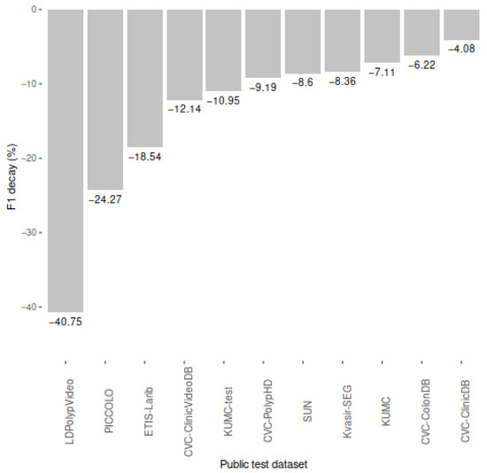 F1 decay (%) in public colonoscopy image datasets compared to the performance of our model in our private dataset reported in Nogueira-Rodríguez et al., 2021 (0.88) [26].