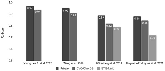 Only 3 out of the 20 studies had the same exact setup that we had: training the model with a private dataset, testing it with a test partition of the private dataset (intra-dataset performance), and finally testing it using one or more public datasets (inter-dataset performance estimation). As shown in Figure 7, the F1-score also decayed in those studies when analyzing the public datasets with respect to the private test set. In the case of the CVC-ClinicDB dataset, used by the four studies, the average decay was about 5%. In the ETIS-Larib dataset, the Wittenberg et al., 2019 [36] study decayed by 11.24%, compared to our 18.54% decrease.