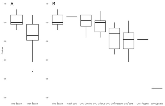 With the aim of further exploring the intra-to-inter performance decay in other studies, we analyzed the evaluations on public datasets collected in Section 2.5. Such evaluations are heterogeneous regarding the datasets used for training and testing, the models used, and other similar factors. Thus, we compared the intra-dataset performances (i.e., a performance evaluation on a test split of the dataset used for model development, either private or public) against the inter-dataset performances (i.e., a performance evaluation on a dataset different than the one used for model development). As Figure 8A shows, the intra-dataset performances were usually higher than the inter-dataset performances. Figure 8B shows the inter-dataset distribution disaggregated by the public dataset on which the evaluation was carried out. It is important to note that three public datasets (PICCOLO, KUMC, and SUN) are under the intra-dataset performance box, as they are only used in intra-dataset setups. These results are in line with the results obtained in our experiment that show a decay in the F1-score when the evaluation was carried out on a different test dataset.