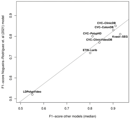 Interestingly, the two datasets in which the decay of our model was lower (CVC-ClinicDB and CVC-ColonDB) are also two of the three datasets in which the published studies obtained performances closer to the intra-dataset ones; also, two of the three datasets in which the performance was worse in the published studies (ETIS-Larib and LDPolypVideo) were two of the most challenging for our model. In the light of these observations, we correlated our performance in the seven datasets shown in Figure 8B with the median inter-dataset performances of the published studies. Figure 9 allows us to observe that such correlation exists (p-value < 0.001), showing that our exhaustive testing reveals the inherent degree of difficulty of the public datasets; a single model (ours) showed the same behavior as the aggregation of the published research, taking into account that studies are heterogeneous (different models and different training datasets) and that we picked the highest F1-scores of those performing several analyses.